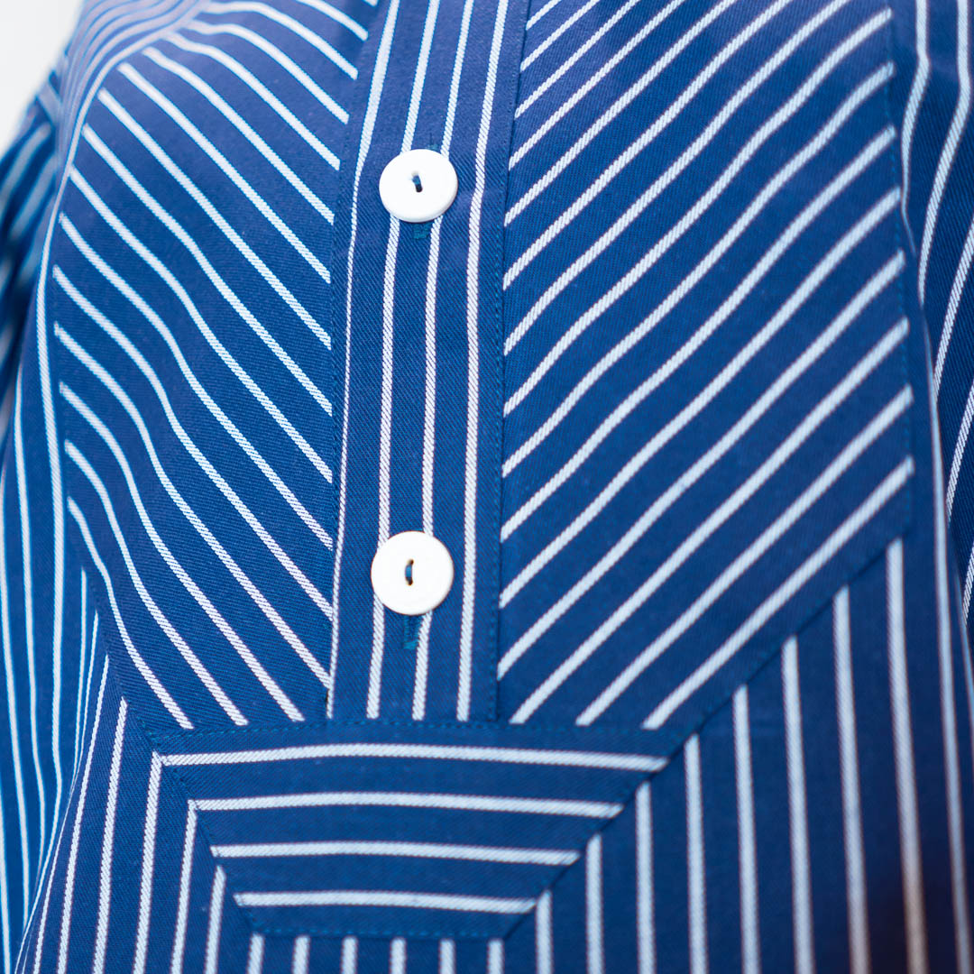 Das Finkenwerder Fischerhemd – tailliert zeichnet sich durch die weißen Knöpfe und das schräggestreifte Revers aus. Den Stehkragen trägt man aufgeschlagen – traditionell mit einem Tuch und Knoten darunter. Das Finkenwerder Fischerhemd hat Ärmelbündchen mit jeweils einem Knopf. Man trägt die Ärmel allerdings auch bei diesem Hemd aufgekrempelt.
