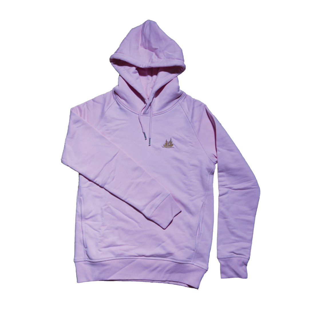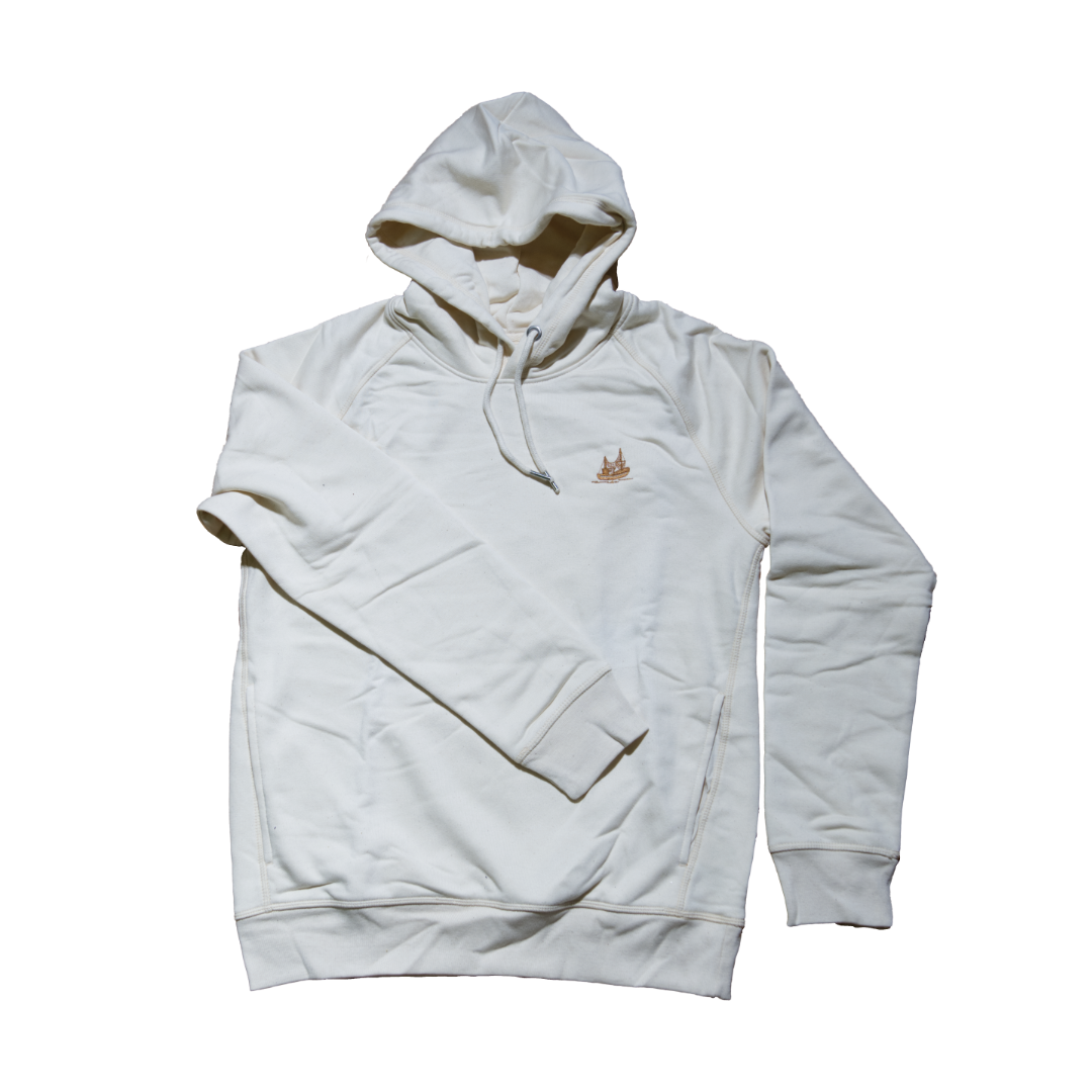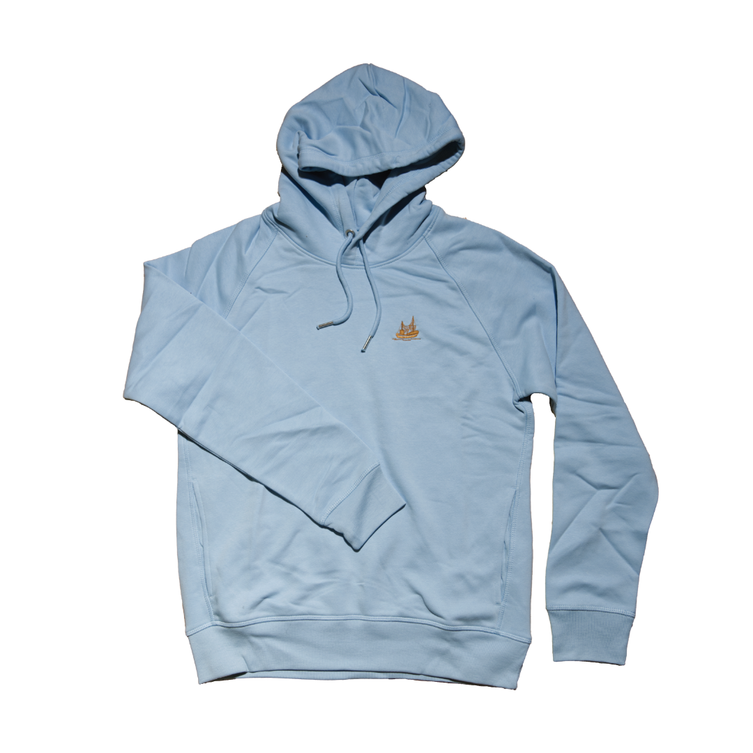 Der Hoodie mit unserem kleinen, gestickten Kutter hat Raglanärmel und ein 1×1 Rippstrick an den Ärmelenden und unteren Saum. Das Nackenband ist in Fischgrätenmuster. Im Nacken hat der Pullover einen abgesetzten Halbmond im Eigenstoff, genauso wie die Kapuze mit abgesetztem Futter. Er hat Flatlockabsteppung auf allen Nähten. Außerdem hat der Hoodie Seitentaschen.